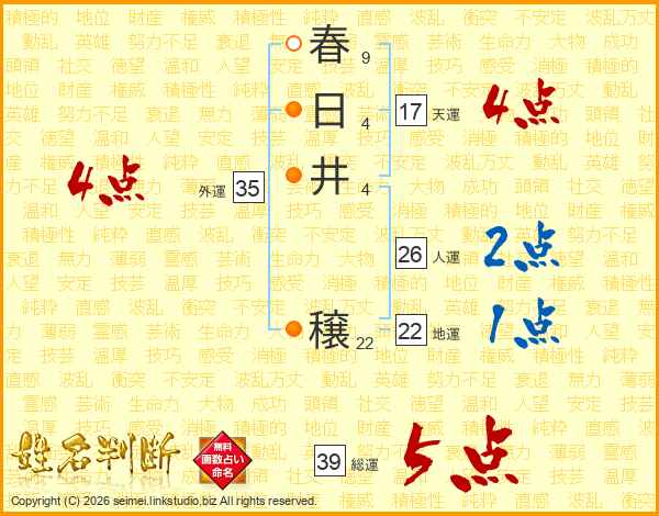 生活面を象徴する運勢です。外部から受ける影響力を表し、結婚運、家庭運や職場、環境への順応性を表します。総運から人運を引いた画数。姓や名が1文字の場合を除く。