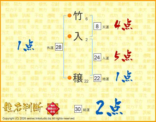 生活面を象徴する運勢です。外部から受ける影響力を表し、結婚運、家庭運や職場、環境への順応性を表します。総運から人運を引いた画数。姓や名が1文字の場合を除く。