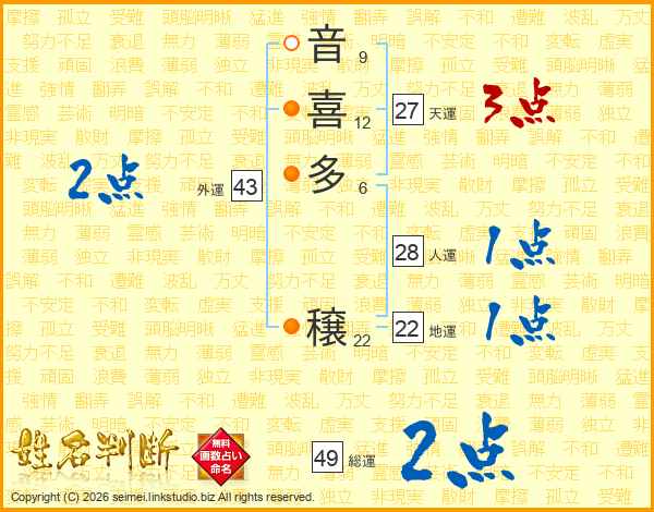 画数の奇数(○陽)と偶数(●陰)の配列で吉凶を占います。どちらかにかたよる名前は大凶名で避ける必要があります。画数の奇数偶数。
