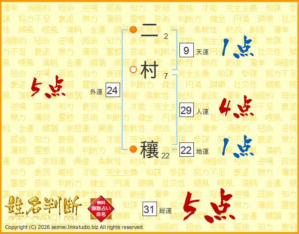 生活面を象徴する運勢です。外部から受ける影響力を表し、結婚運、家庭運や職場、環境への順応性を表します。総運から人運を引いた画数。姓や名が1文字の場合を除く。