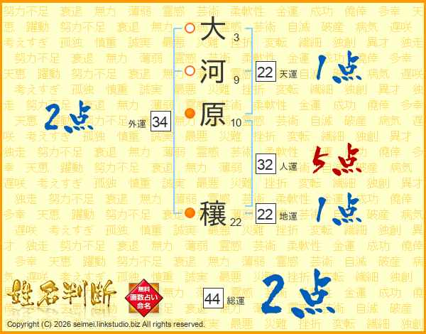 あなたの人生を表す1番重要な運勢です。生涯を通じて影響する総合運となり、主に50歳以降の晩年期に影響を及ぼします。苗字と名前の合計画数。