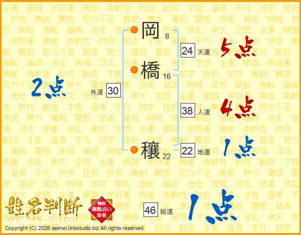 生活面を象徴する運勢です。外部から受ける影響力を表し、結婚運、家庭運や職場、環境への順応性を表します。総運から人運を引いた画数。姓や名が1文字の場合を除く。