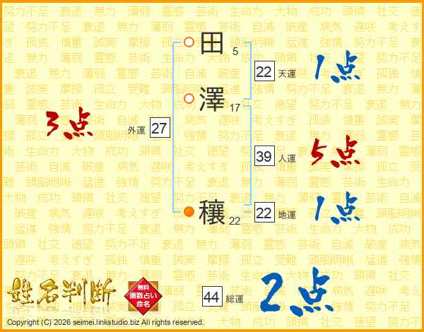 生活面を象徴する運勢です。外部から受ける影響力を表し、結婚運、家庭運や職場、環境への順応性を表します。総運から人運を引いた画数。姓や名が1文字の場合を除く。