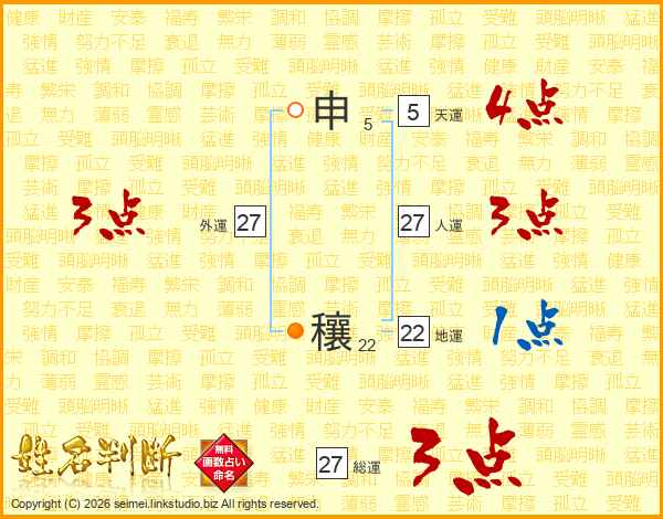 生活面を象徴する運勢です。外部から受ける影響力を表し、結婚運、家庭運や職場、環境への順応性を表します。総運から人運を引いた画数。姓や名が1文字の場合を除く。