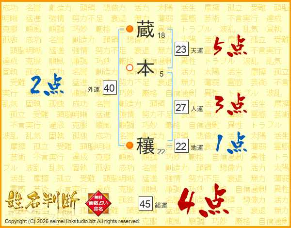 蔵本穰さんの総運は45画の4点!