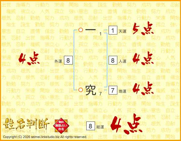 あなたの人生を表す1番重要な運勢です。生涯を通じて影響する総合運となり、主に50歳以降の晩年期に影響を及ぼします。苗字と名前の合計画数。