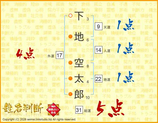 下(3画)地(6画) 空(8画)太(4画)郎(10画)