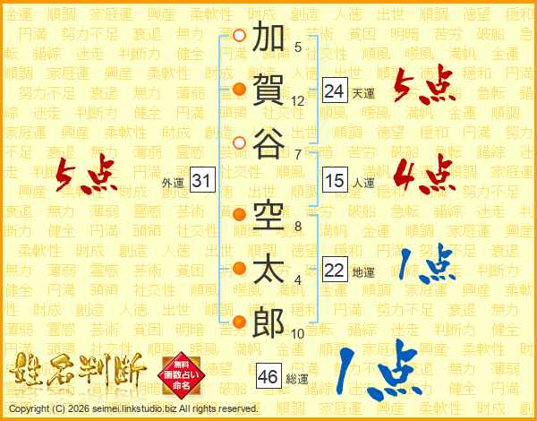 加(5画)賀(12画)谷(7画) 空(8画)太(4画)郎(10画)