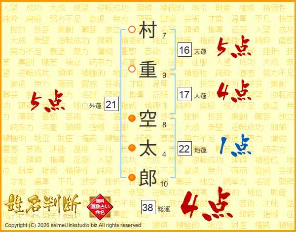 村(7画)重(9画) 空(8画)太(4画)郎(10画)