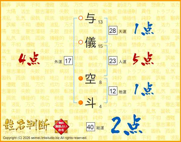 生活面を象徴する運勢です。外部から受ける影響力を表し、結婚運、家庭運や職場、環境への順応性を表します。総運から人運を引いた画数。姓や名が1文字の場合を除く。