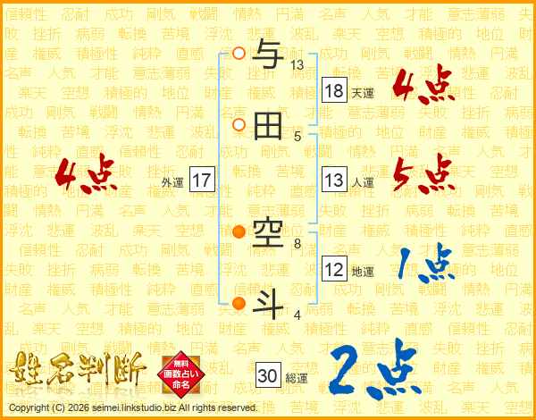 生活面を象徴する運勢です。外部から受ける影響力を表し、結婚運、家庭運や職場、環境への順応性を表します。総運から人運を引いた画数。姓や名が1文字の場合を除く。