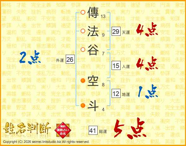 生活面を象徴する運勢です。外部から受ける影響力を表し、結婚運、家庭運や職場、環境への順応性を表します。総運から人運を引いた画数。姓や名が1文字の場合を除く。