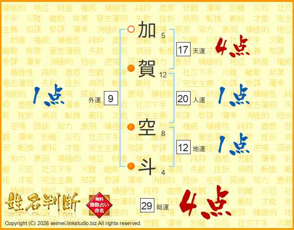 生活面を象徴する運勢です。外部から受ける影響力を表し、結婚運、家庭運や職場、環境への順応性を表します。総運から人運を引いた画数。姓や名が1文字の場合を除く。