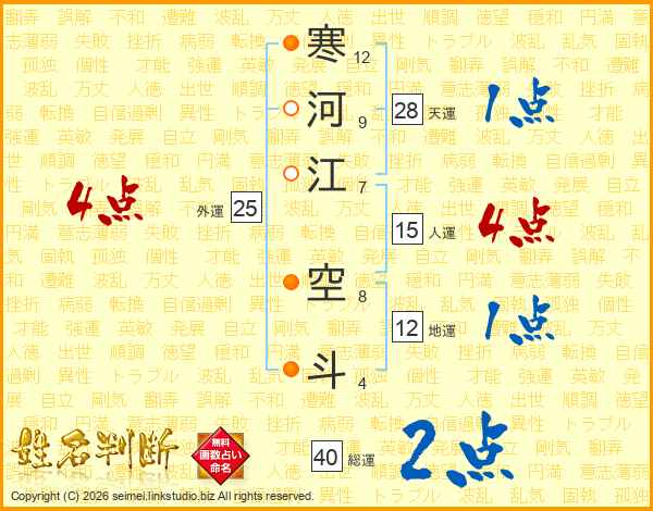 生活面を象徴する運勢です。外部から受ける影響力を表し、結婚運、家庭運や職場、環境への順応性を表します。総運から人運を引いた画数。姓や名が1文字の場合を除く。
