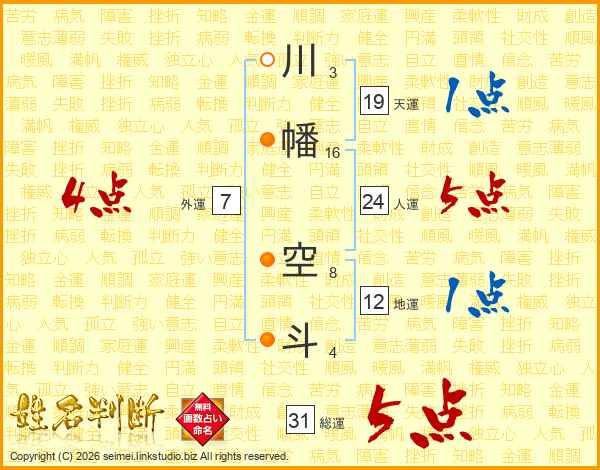 川幡空斗さんの総運は31画の5点!