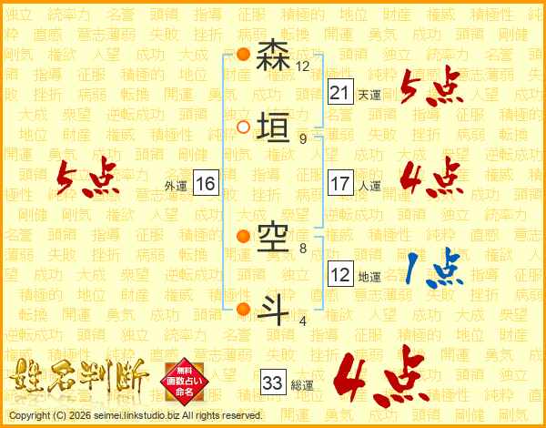 生活面を象徴する運勢です。外部から受ける影響力を表し、結婚運、家庭運や職場、環境への順応性を表します。総運から人運を引いた画数。姓や名が1文字の場合を除く。