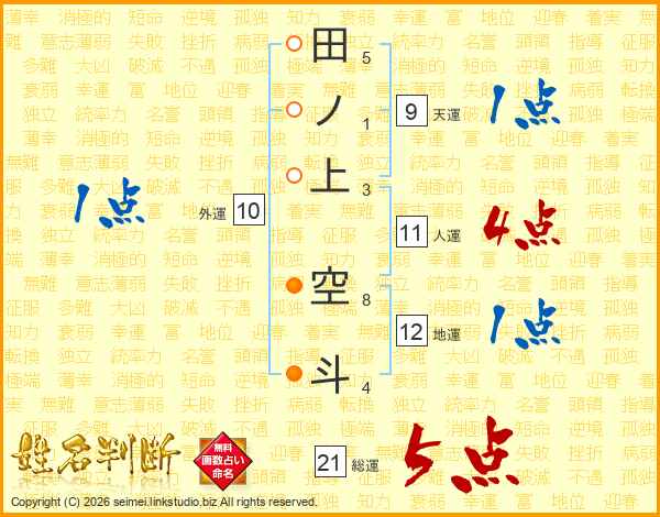 生活面を象徴する運勢です。外部から受ける影響力を表し、結婚運、家庭運や職場、環境への順応性を表します。総運から人運を引いた画数。姓や名が1文字の場合を除く。