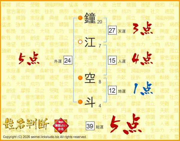 鐘江空斗さんの総運は39画の5点!