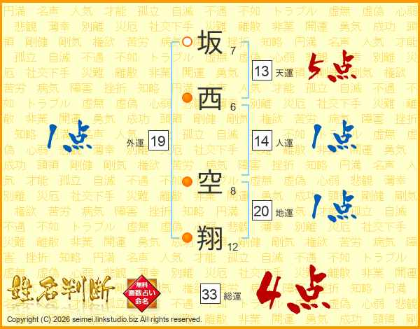 生活面を象徴する運勢です。外部から受ける影響力を表し、結婚運、家庭運や職場、環境への順応性を表します。総運から人運を引いた画数。姓や名が1文字の場合を除く。