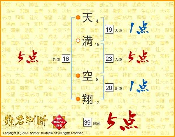 生活面を象徴する運勢です。外部から受ける影響力を表し、結婚運、家庭運や職場、環境への順応性を表します。総運から人運を引いた画数。姓や名が1文字の場合を除く。