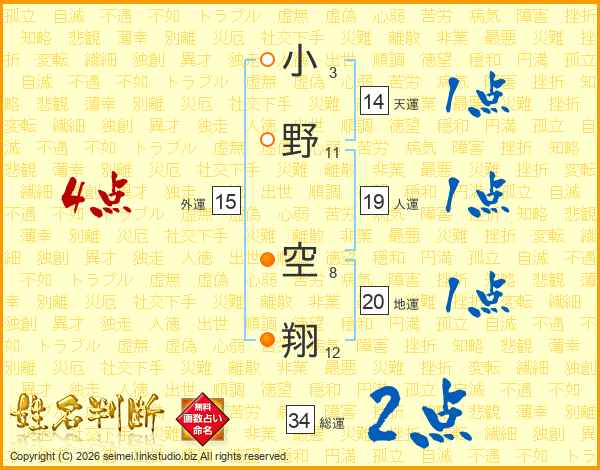 小(3画)野(11画) 空(8画)翔(12画)