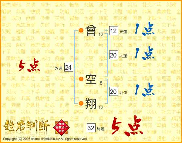 生活面を象徴する運勢です。外部から受ける影響力を表し、結婚運、家庭運や職場、環境への順応性を表します。総運から人運を引いた画数。姓や名が1文字の場合を除く。