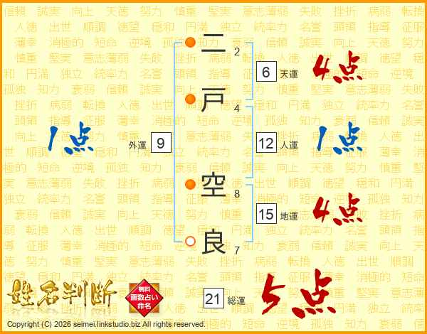 生活面を象徴する運勢です。外部から受ける影響力を表し、結婚運、家庭運や職場、環境への順応性を表します。総運から人運を引いた画数。姓や名が1文字の場合を除く。