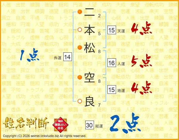 生活面を象徴する運勢です。外部から受ける影響力を表し、結婚運、家庭運や職場、環境への順応性を表します。総運から人運を引いた画数。姓や名が1文字の場合を除く。