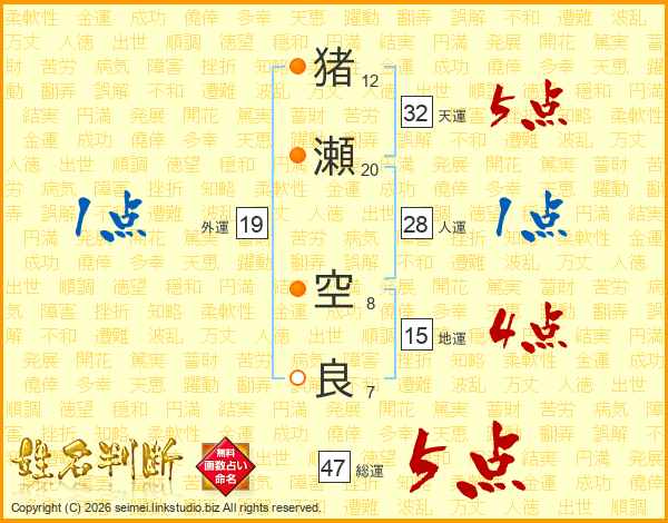 猪瀬空良さんの総運は47画の5点!