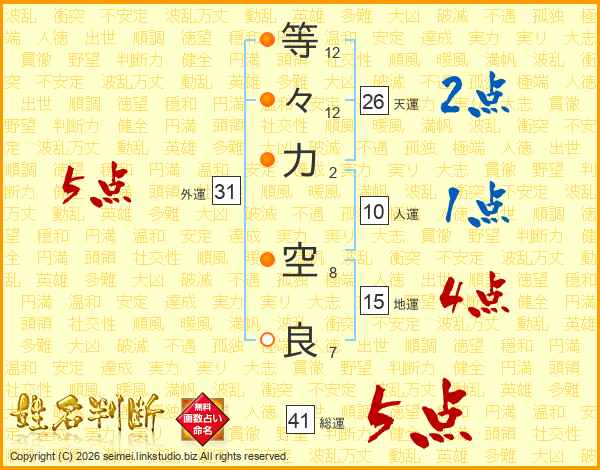 生活面を象徴する運勢です。外部から受ける影響力を表し、結婚運、家庭運や職場、環境への順応性を表します。総運から人運を引いた画数。姓や名が1文字の場合を除く。