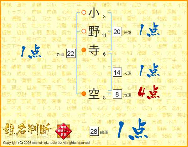 生活面を象徴する運勢です。外部から受ける影響力を表し、結婚運、家庭運や職場、環境への順応性を表します。総運から人運を引いた画数。姓や名が1文字の場合を除く。