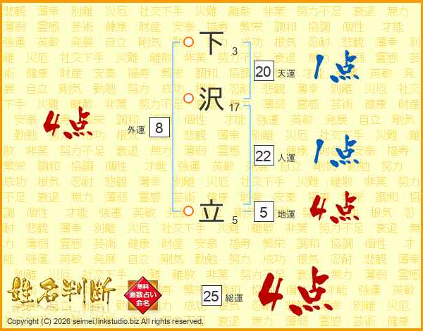 生活面を象徴する運勢です。外部から受ける影響力を表し、結婚運、家庭運や職場、環境への順応性を表します。総運から人運を引いた画数。姓や名が1文字の場合を除く。