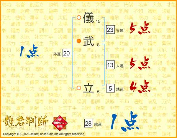 生活面を象徴する運勢です。外部から受ける影響力を表し、結婚運、家庭運や職場、環境への順応性を表します。総運から人運を引いた画数。姓や名が1文字の場合を除く。