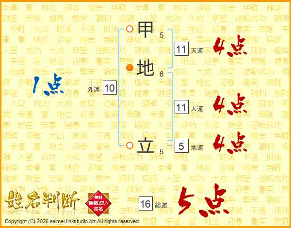 生活面を象徴する運勢です。外部から受ける影響力を表し、結婚運、家庭運や職場、環境への順応性を表します。総運から人運を引いた画数。姓や名が1文字の場合を除く。