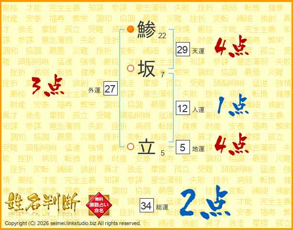 鯵坂立さんの総運は34画の2点!