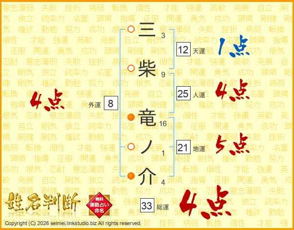 三(3画)柴(9画) 竜(16画)ノ(1画)介(4画)