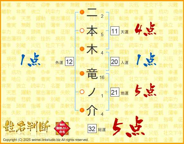 二(2画)本(5画)木(4画) 竜(16画)ノ(1画)介(4画)