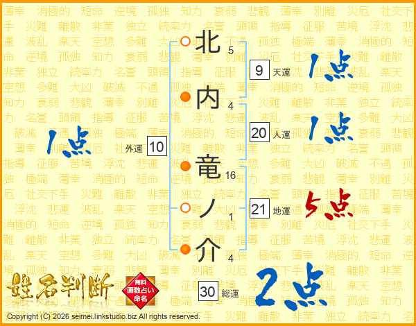 北(5画)内(4画) 竜(16画)ノ(1画)介(4画)