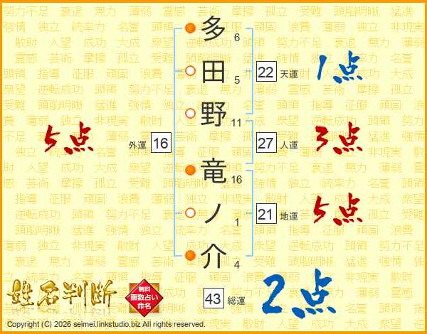 多(6画)田(5画)野(11画) 竜(16画)ノ(1画)介(4画)