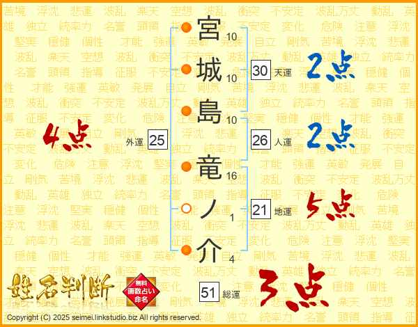 宮(10画)城(10画)島(10画) 竜(16画)ノ(1画)介(4画)