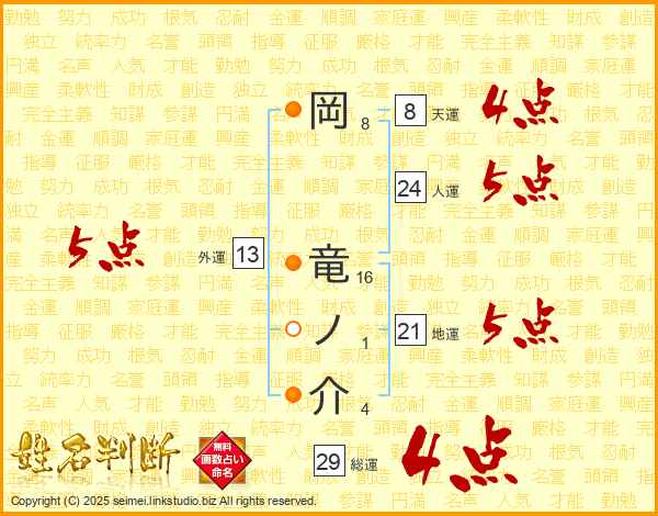 岡(8画) 竜(16画)ノ(1画)介(4画)