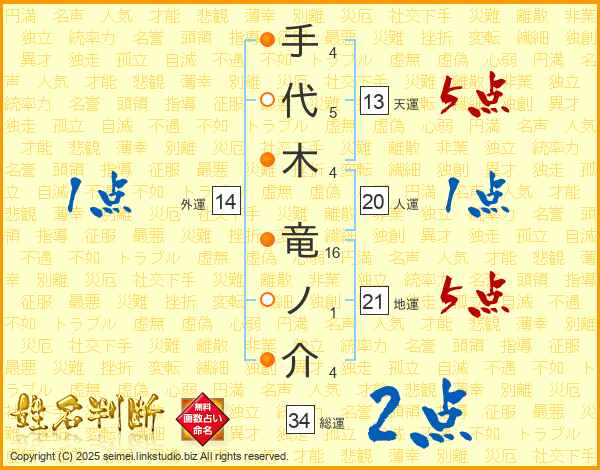 手代木竜ノ介さんの総運は34画の2点!