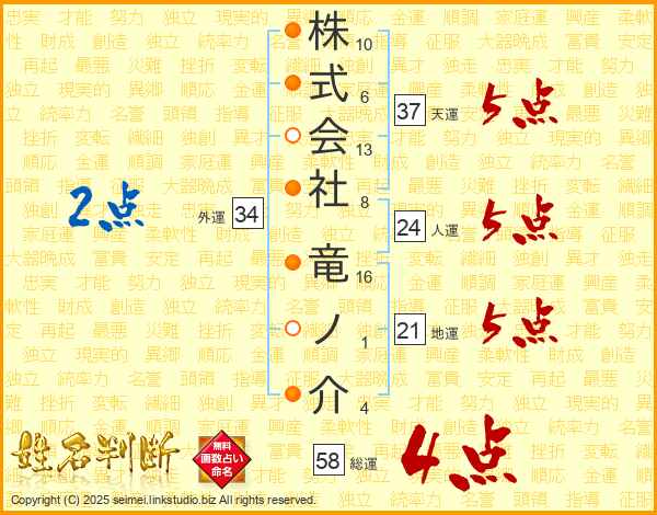 株(10画)式(6画)会(13画)社(8画) 竜(16画)ノ(1画)介(4画)