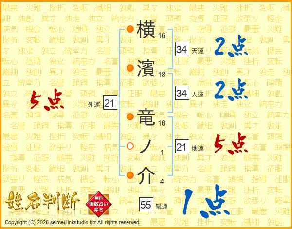 横(16画)濱(18画) 竜(16画)ノ(1画)介(4画)