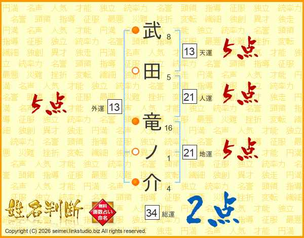 武(8画)田(5画) 竜(16画)ノ(1画)介(4画)