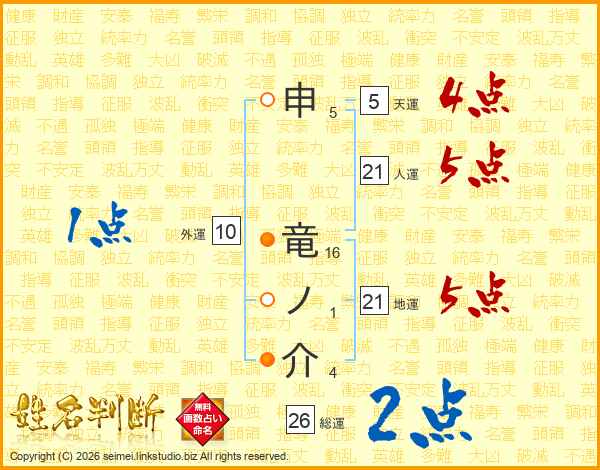 申竜ノ介さんの総運は26画の2点!