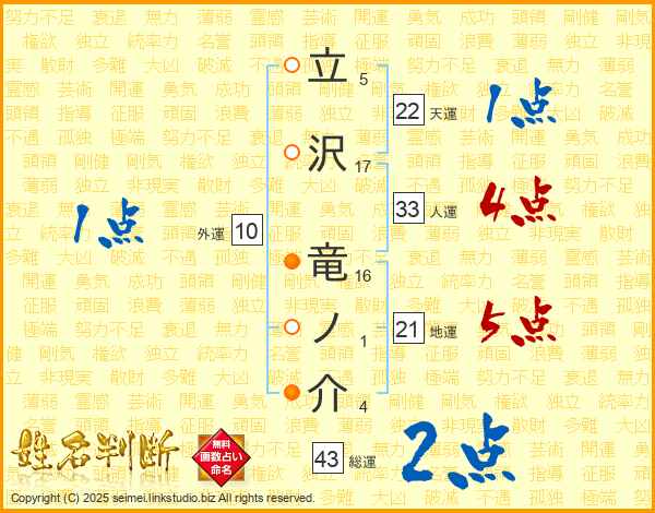 立(5画)沢(17画) 竜(16画)ノ(1画)介(4画)