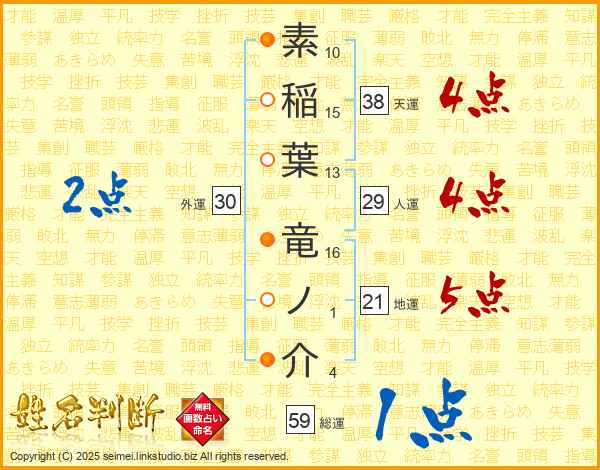 素(10画)稲(15画)葉(13画) 竜(16画)ノ(1画)介(4画)