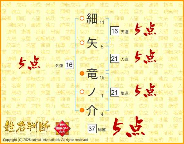 細(11画)矢(5画) 竜(16画)ノ(1画)介(4画)