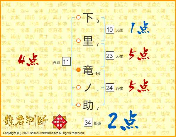 下里竜ノ助さんの総運は34画の2点!